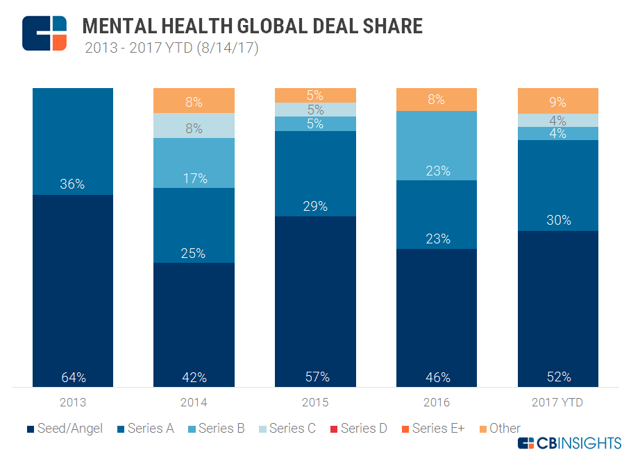 The largest VC-backed Series A investments in 2017 YTD have been a $35M round to behavioral health telemedicine platform Lyra Health, a $34M round of meditation app Headspace, and a $17M round to emotional wellness app Lantern.